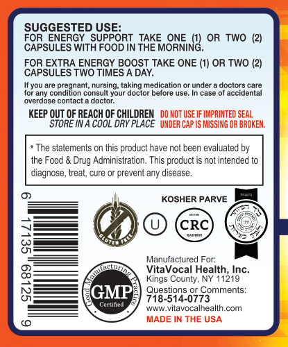 Introducing VitaVocal's Vita Energy Boost plus Vision Support – a smart answer to the demands of busy life today. We know how important it is to keep your energy up and your vision sharp in today's fast world. Our special supplement is made with natural stuff like Vitamin B12, Rhodiola Rosea, Green Tea, Eleuthero Root, American Ginseng, Gotu Kola Extract, Guarana Extract, Catuaba Bark Powder, Bilberry Powder, Lutein, and Astaxanthin. All of these things mixed together make a powerful way to boost your energy and help your vision.
